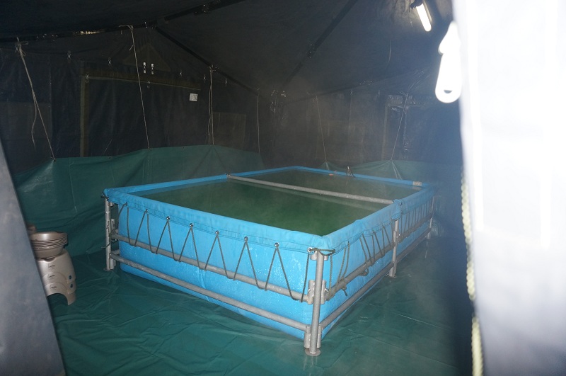 体育館の倉庫に入っている荷物を全部出して、洗剤で床から棚まで全部拭いて、そこを感染した方を入れる場所にしました。体育館の出口に大きいテントを置いて、その中にトイレも設置しました。