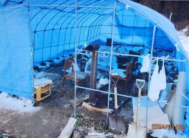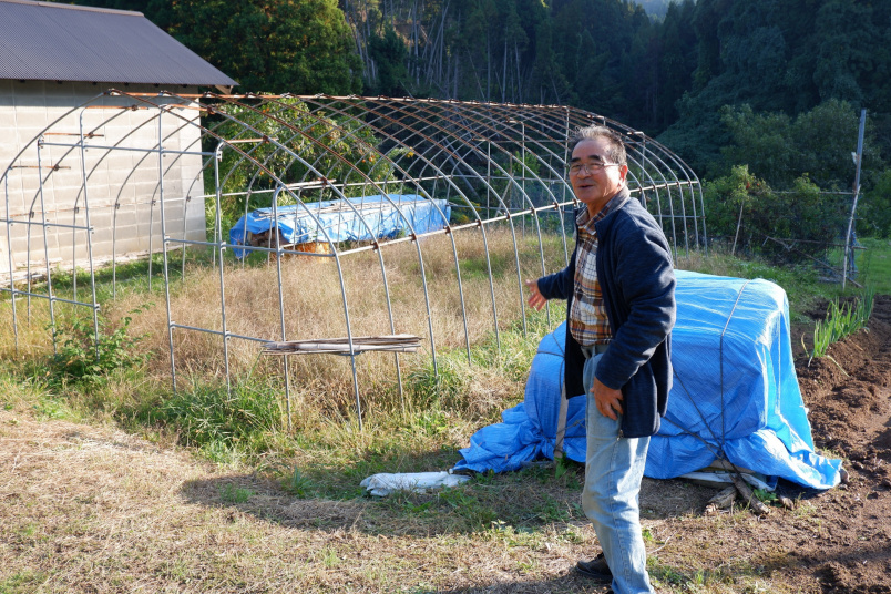 今回の地震の時は、まずその広いところに行って、そのハウスにブルーシートをかけて、他の先のことを考える余裕なんてなかったんですから、まずその場しのぎの形でシート張って、うちはたまたま薪ストーブがあったものですから、薪ストーブをそっちに持って行って暖房を取りました。年老いた人は寒い中、ちょっと横になる程度だけでしたけど。寒かったですね。私らちょっと元気な人たちは、その晩は一睡もしないで、暖を取るのに薪ストーブ焚いて、あと車中泊で一晩過ごしました。ほとんどの人は車中泊ですね。