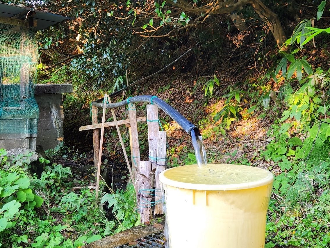 集落の自己管理の山の中から出てくる湧き水です。それは傾斜になっていますので、ポンプも何もいらない自然流です。それを途中から切って、ホースで。