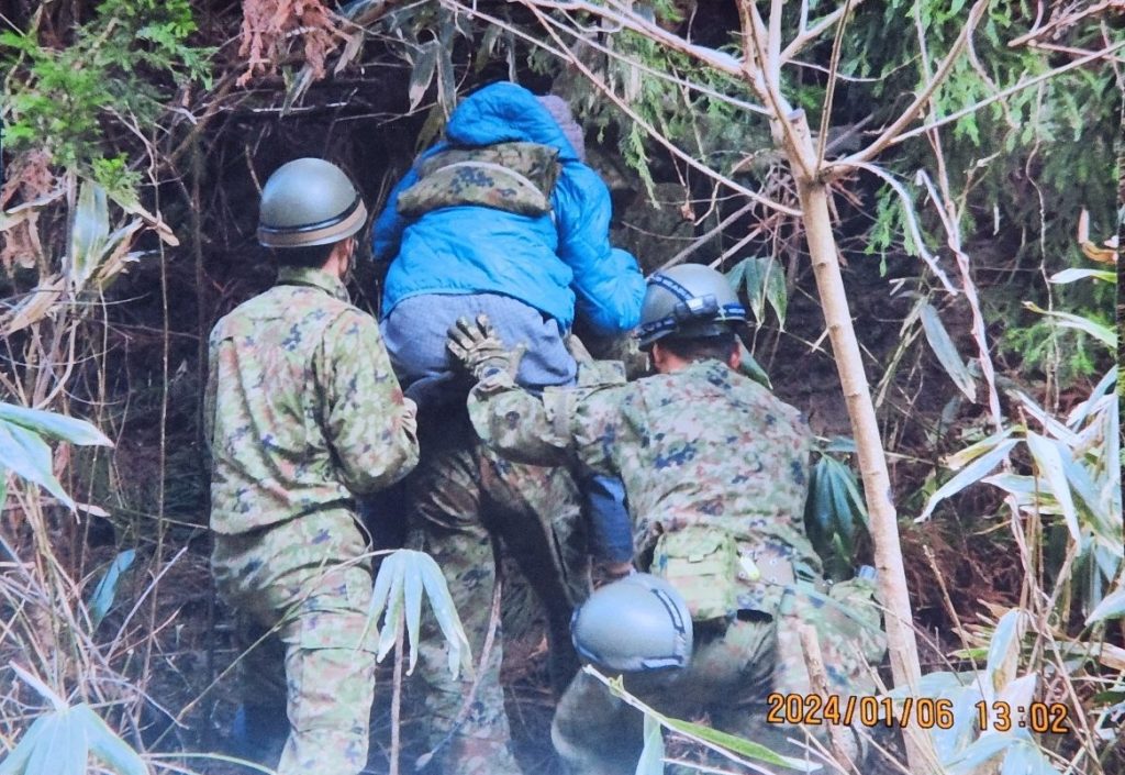 それから、食べるものとかそういうものは十分あったんですけど、5日の日、寒いものですから体調を崩す人が出てきました。自衛隊の方が衛星電話を4日に持ってきてくれて、連絡ができるようになっていましたので、防災対策課の方に「体調を崩した人がいるのでヘリコプターをお願いします」という連絡はできるようになったんです。1月5日はそうですね。5日、6日はぼちぼちと金沢の方へ避難する人がいて、その人たちを送るのに道路がないもんですから、若い元気な人たちが、ここから1キロもあるかな、ちょっと切れるほどのところまで、みんなで送ってあげて、下の道から上の崖まで20、30メートルありますかね。山の中をロープを伝って下から上へ人を運びました。年いった方は自衛隊の方におんぶされて。それはヘリコプターを使わずに、金沢から子供さんたちが迎えに浦上から入っていたんですけど、途中まで車で来て、歩いて迎えに来た人たちを車のところまで送る、そんな感じです。